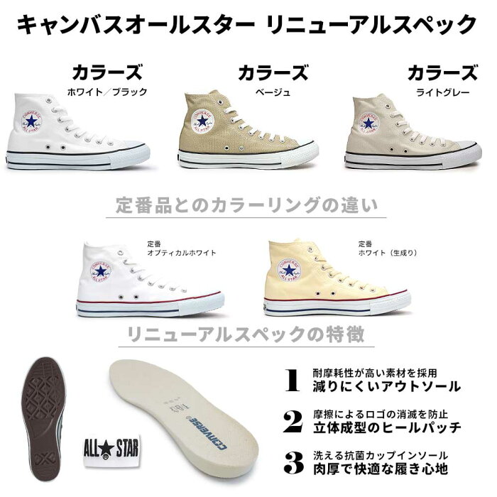 【キャンバスオールスター リニューアルスペック】1.アウトソールの配合変更(耐摩耗性の向上) 2.クッション性の高いカップインソール(抗菌加工)採用で履き心地向上 3.立体成型ヒールパッチでロゴの消滅防止※シューホール(ヒモを通す穴)の数はサイズにより変動しますので、お届けする商品が写真と異なる場合があります。